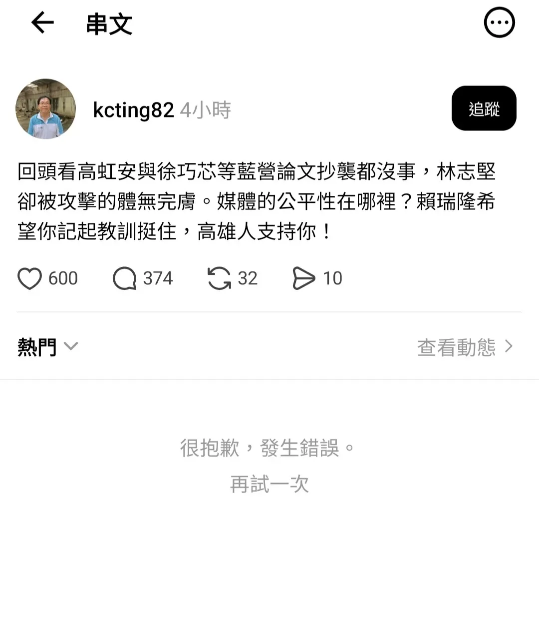一名网友今日在社群平台Threads发文表示,「回头看高弘安与徐巧芯等蓝营论文抄袭都没事,林智坚却被攻击的体无完肤。媒体的公平性在哪里?赖瑞隆希望记起教训挺住,高雄人支持你。」