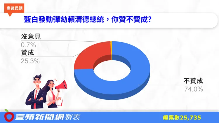 《壹苹》询问读者,「蓝白发动弹劾赖清德总统,你赞不赞成?」结果显示,投票5天来累计2万5735人参加投票。