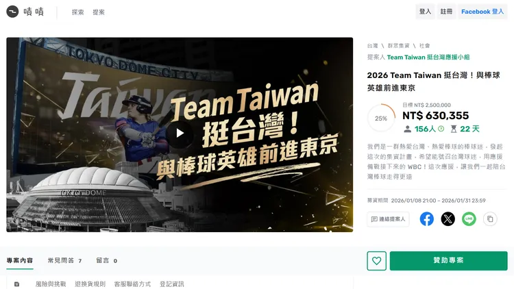 「Team Taiwan挺台湾应援小组」在啧啧平台发动募款,规划应援台湾队的4阶段,如果募款达250万元,就购买东京巨蛋周围广告看板,放上属于Team Taiwan的应援宣传,「将东京巨蛋周边打造成视觉上的『台湾主场』」;如果募款650万元,广告看板就增加至东京车站、机场。