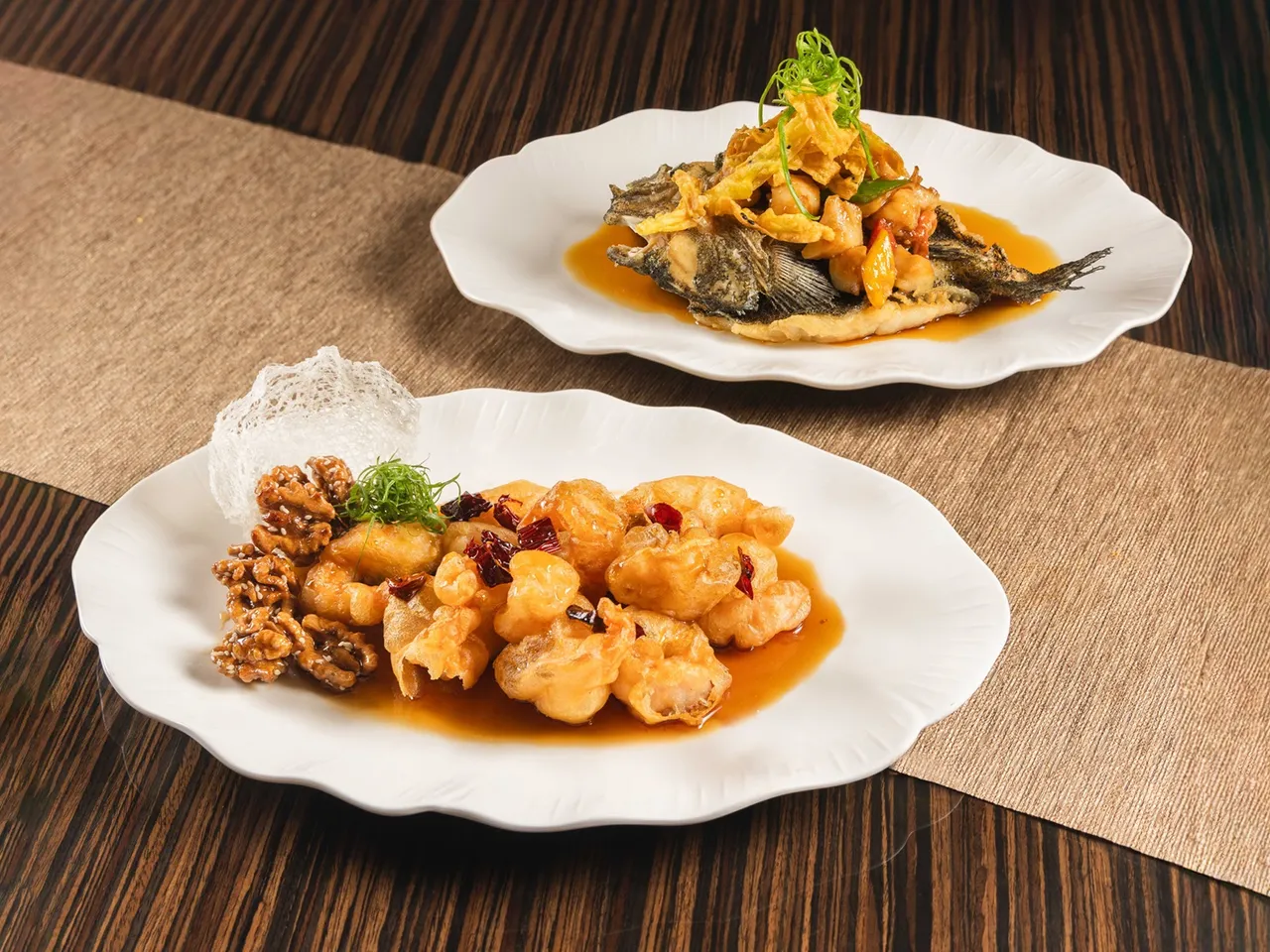 采用澎湖新鲜大虾仁,以盐巴、油、太白粉腌制24小时入味,裹上由蛋白、油与泡水过的太白粉调的秘制湿粉后,下锅以180°C油温酥炸至外层蓬松酥脆,搭佐果醋、陈醋、冰糖特调的酸甜酱汁起锅翻炒,最后辅以油炸过的糖衣核桃、薄脆金黄米网点缀上桌,酸香海味完美交融。