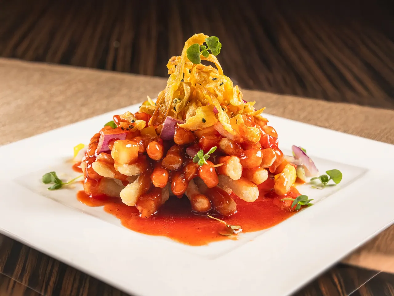 取自黑毛猪最珍贵的松阪部位,肉质弹牙脆口、油花分布均匀,主厨以经典松鼠黄鱼为灵感,将肉片采16划十字花刀后用姜汁、绍兴酒、盐巴等腌制12小时,裹上一层蛋黄及薄粉后以200°C高温油炸至皮缩肉卷,呈现金黄蓬松的立体造型,再浇淋番茄酱与新鲜柠檬调制的糖醋酱、红黄椒精致点缀,品味酸甜开胃、外酥内嫩的诱人享受。