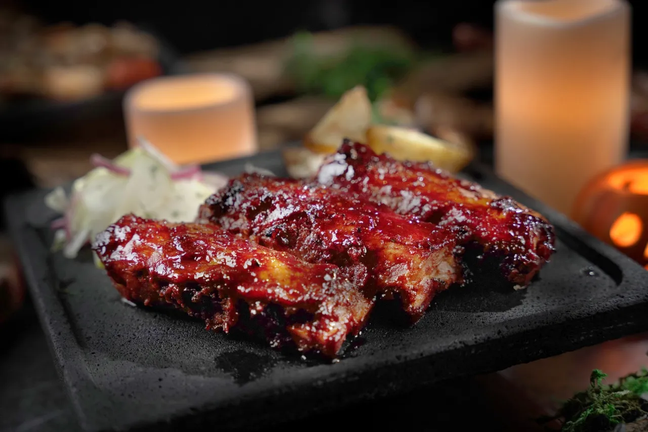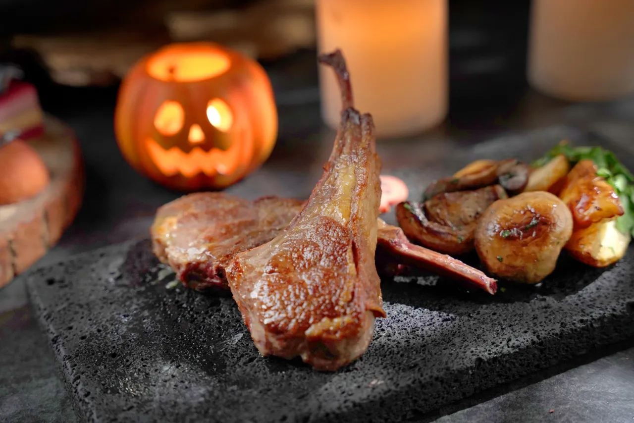 万圣节飨宴的主餐「碳烤12oz猪肋排佐珍珠洋芋」严选台湾猪肋排,以西西里香草与初榨橄榄油低温腌渍入味,炭火慢烤锁住肉汁,外层焦香微脆、内里柔嫩多汁。肉香交织著淡淡烟熏气息,口感层次丰富。「碳烤羊排佐珍珠洋芋」 采用纽西兰小羔羊排,经迷迭香与蒜末腌渍后碳烤至五分熟,草本香气融合肉汁,搭配松露盐拌洋芋,风味优雅平衡。「碳烤6oz肋眼牛排佐珍珠洋芋」选用美国Prime级肋眼,以西西里直火碳烤,外焦内嫩、香气浓郁,简约调味展现极致原味。