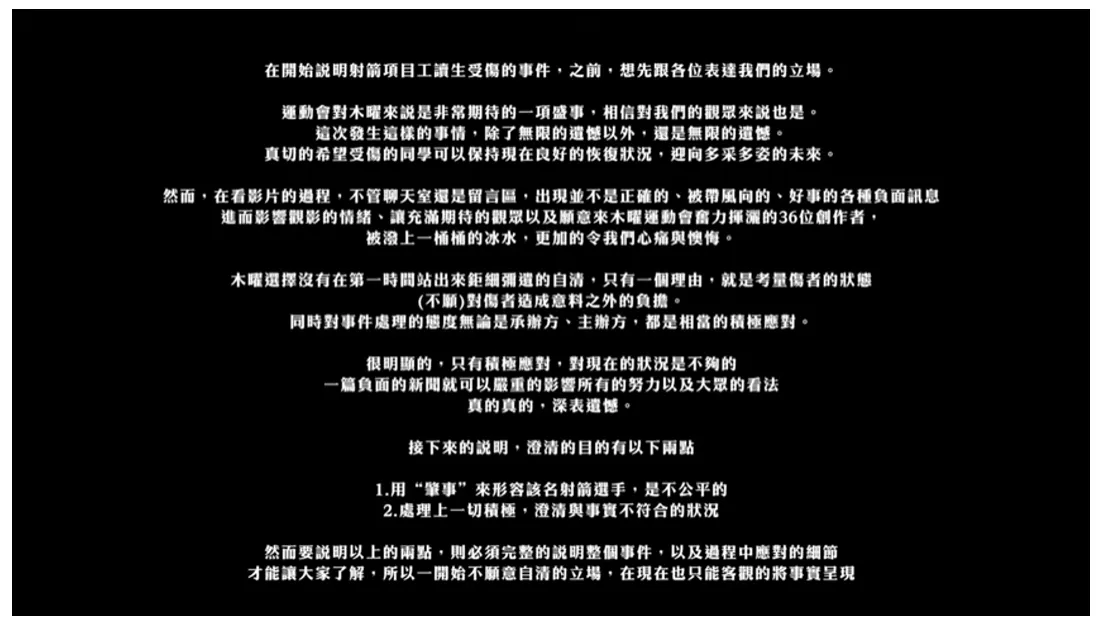 遭控神隐的百万YouTuber「J-Bao贱葆」昨日在频道发影片公开说明,承认射伤人的该回合选手「就是我们」,但是他们都有遵守赛事规则,听从教练、裁判指示才射箭,责任不在选手身上,所以制作单位才会不肯透露选手身分,他还说现场布置有许多气球遮蔽,工读生站在视线死角,所以选手没办法看到。下方《木曜4》声明全文: