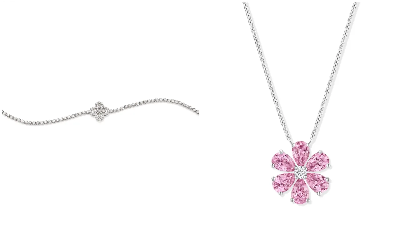 Diamond Loop系列钻石手链中央镶嵌4颗水滴形切割钻石,搭配81颗圆形明亮式切割钻石,共重约4.41克拉,底座为铂金;勿忘我Forget-Me-Not系列粉红刚玉和钻石坠炼镶嵌12颗水滴形切割粉红刚玉(重约2.29克拉)、2颗圆形明亮是切割钻石(重约0.07克拉),底座为铂金。