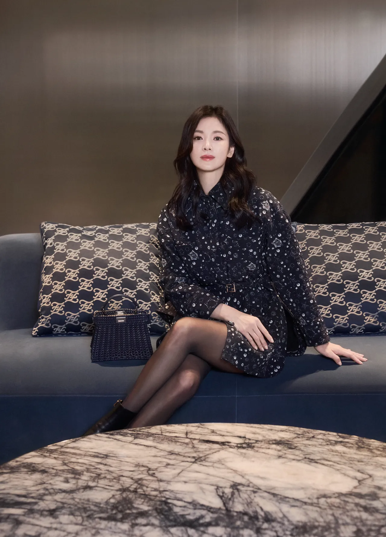 宋慧乔身上所穿的午夜蓝单襟外套与迷你裙,其上印满灵感缘于FENDI五姊妹的星夜印花,不论是配搭黑色牛皮编织Peekaboo ISeeU Petite包款,或是银色Selleria Baguette包款,都相当有节庆氛围。