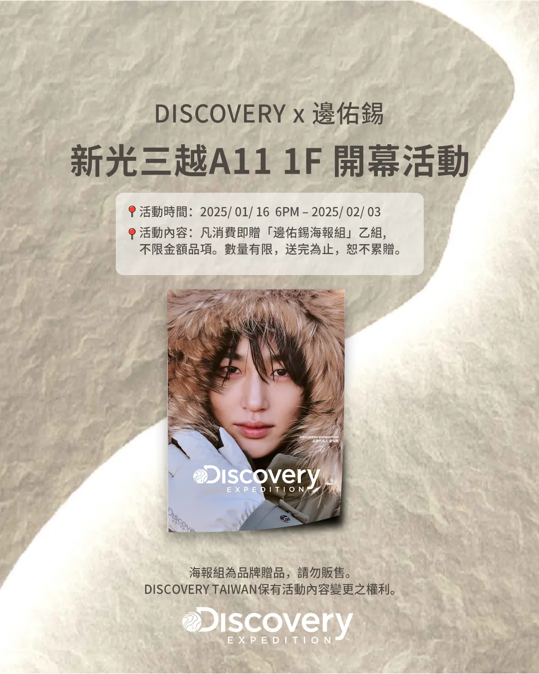 由于Discovery Expedition近日迎来全新代言人,宣布由新一代韩国男神边佑锡从孔刘手上接下代言大任,品牌也为各位「边太太」端出优优惠活动,即日起至2月3日,于Discovery Expedition不限消费金额即赠边佑锡海报组。