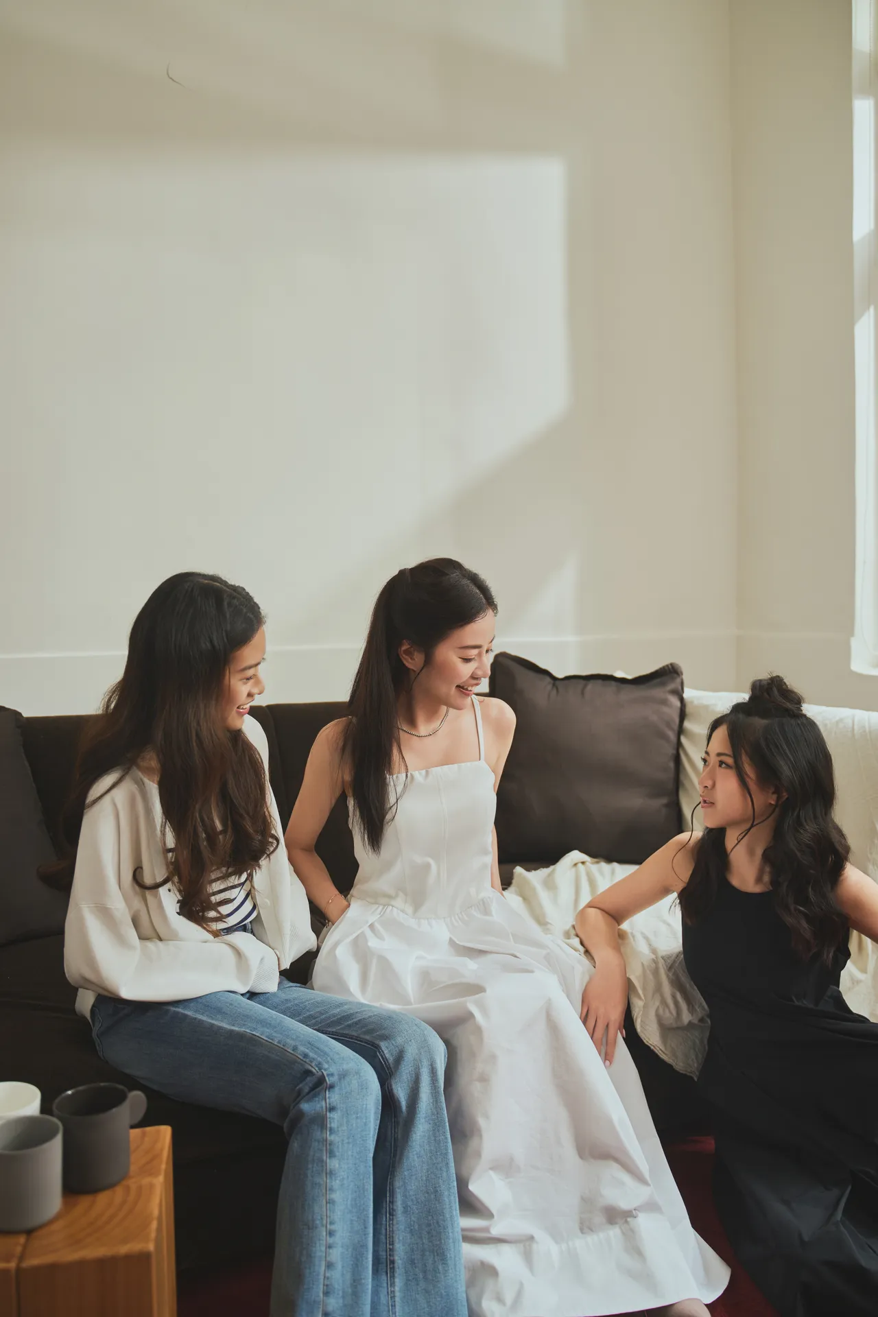 rather此次邀请许菲菲与2位女儿一同演绎《Her & Her Stories》,影片中,穿著rather春夏系列白色吊带洋装的许菲菲,于晨光中替女儿们轻整衣领,让人感受到温馨母爱,2位女儿则分别穿上带有自然皱折感的柔美洋装,以及简约条纹上衣搭配牛仔裤,轻松演绎出日常却不失时髦的风格,而许菲菲还绑起了公主头,在冻龄外貌的加持下更显少女感。