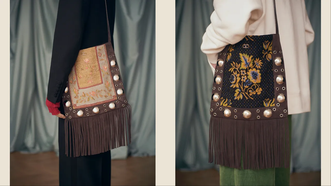 拥有1960年代末自由奔放气息的Valentino Garavani Nellcôte,本季在既有的「嬉皮时尚」风格中,又运用不同材质与装饰元素营造崭新样貌,如斜挎包与托特包采用柔软麂皮打造,并缀以刺绣镜面、饰有几何图案的绚丽提花面料,以及多色珠片或精致花环勾勒出的立体花卉刺绣。此外,最新登场的早秋系列,则进一步带来2款全新迷你尺寸,在细腻小牛皮、麂皮制成的包身上,增添俏皮Cherryfic图案等丰富刺绣细节,为Nellcôte系列包款带来更加多元的风格与搭配可能性。