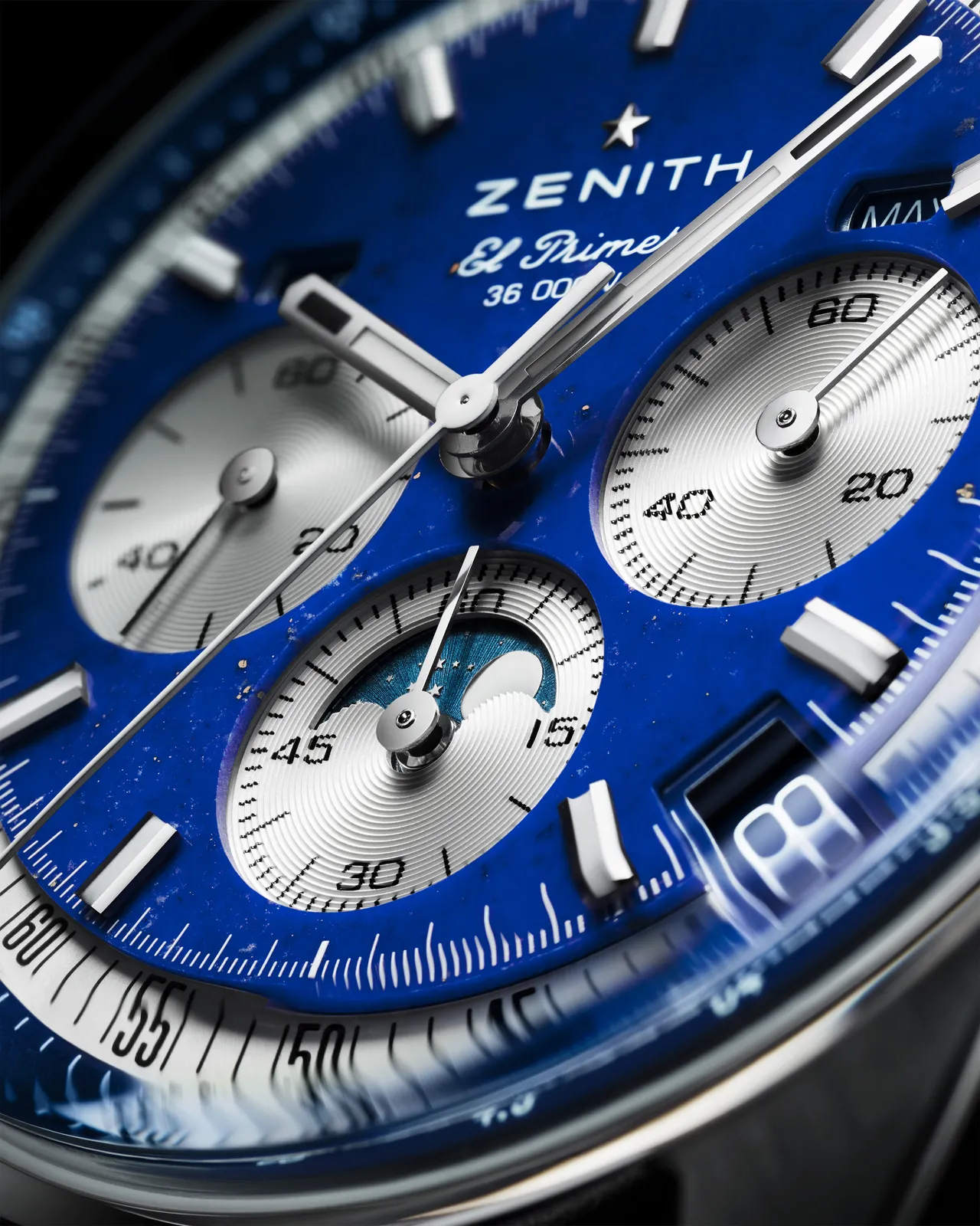 CHRONOMASTER Original全日历月相计时腕表青金石款搭载El Primero 3610型自动上链机芯,此为真力时高振频计时机芯的现代升级版本。机芯具备真正的1/10秒计时功能,计时秒针每10秒在表盘上旋转一圈,精准显示1/10秒。透过透明蓝宝石表背,机芯的精妙构造一览无遗,包括品牌标志性的蓝色导柱轮以及饰有真力时五角星的镂空摆陀 。