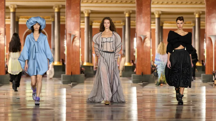 Ghesquière 也保留了他对实验性的偏爱,一件骆驼色大衣被转化为连身短装;一件刷制丝绸的无袖袍点缀满宝石,看似貂皮却隐含古老工艺。压轴的流苏服装则以细致的珠粒层层堆叠,仿佛一座朦胧的花园。与此同时,系列里也有极度简洁的单品,棉质上衣、真丝宽裤,以及锦缎制成的袜子与凉鞋。