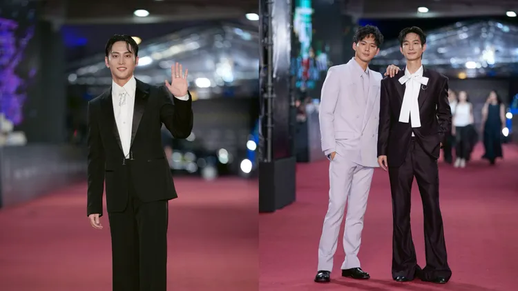 以《星空下的黑潮岛屿》入围迷你剧集(电视电影)男配角奖的黄河,身著DEMO西装,搭配Christian Louboutin皮鞋,黑色西装胸前的白色蝴蝶结设计别具特色,是今晚令人印象深刻的西装造型;吴念轩凭借同剧入围迷你剧集(电视电影)男主角奖,浅紫色的GUCCI西装,也是今晚男星中相当亮眼的存在,双帅合体太养眼。