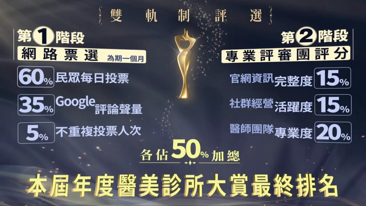 第一阶段为民众投票,占整体分数60%。评分依三项指标计算,包括民众每日投票数(60%)、Google整年度正面评论(35%)以及不重复投票人次(5%)。此阶段主要呈现诊所在一般使用者间的口碑与信任度。