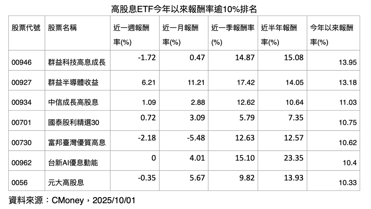 中国信托投信指出,今年市值型ETF普遍跑赢大盘,高股息族群相对落后,但若从「领息+含息报酬率」角度观察,仍有具吸引力的产品。投资人可搭配市值型、主题型ETF,拉高整体总报酬,让资产配置更均衡。