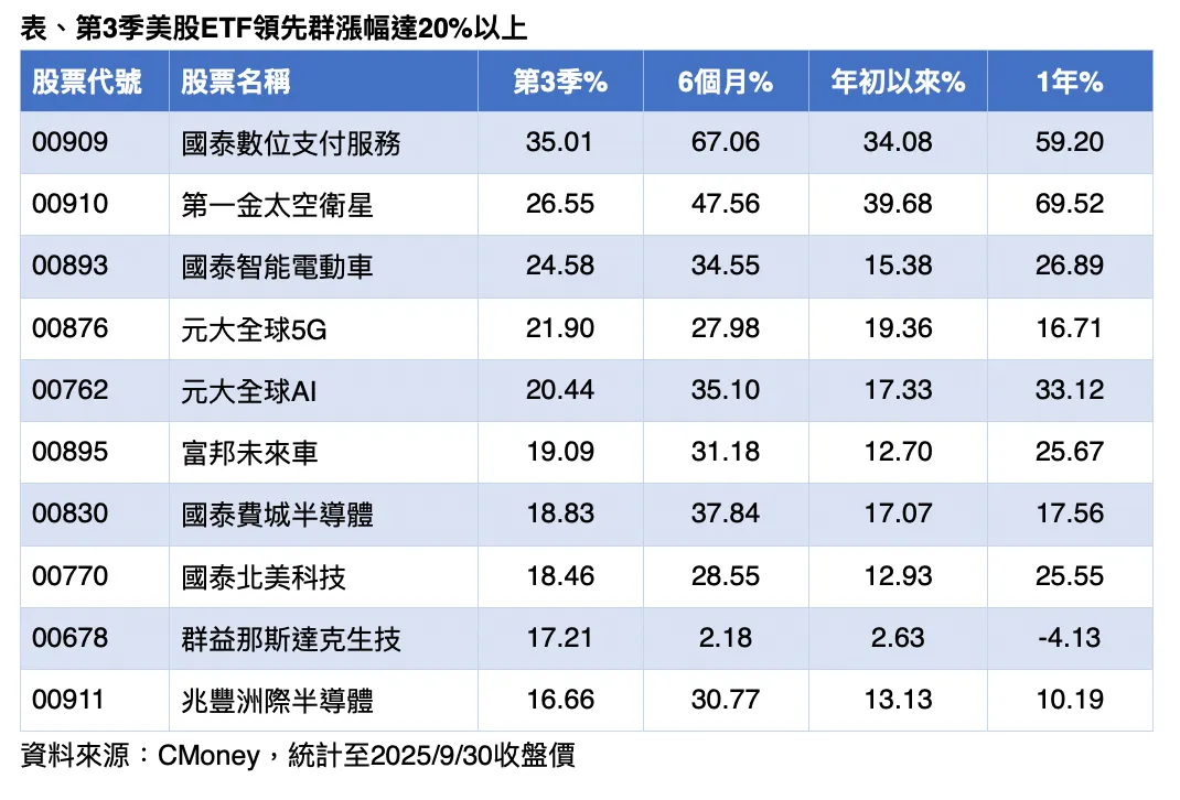 整体来看,第三季美股 ETF 涨势集中在政策加持与创新科技驱动的产业,包括数位支付、太空卫星与 AI,带动资金强力涌入。专家提醒,投资人若看好长期科技浪潮,可留意具成长力与主题趋势的 ETF,搭上政策与产业升级的双重利多。