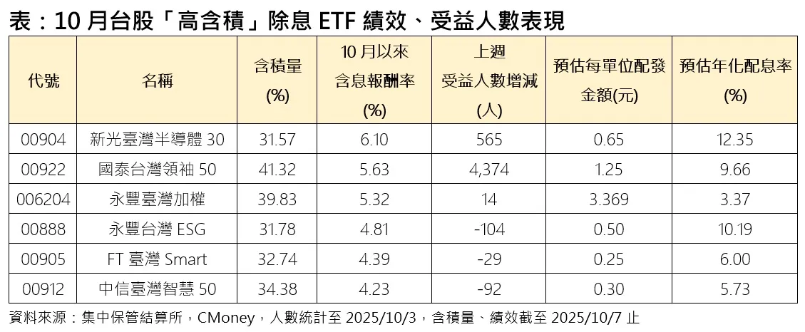根据集保资料,截至 10 月 3 日,10 月预计除息的 6 档台股 ETF 中,以产业型 新光台湾半导体30(00904) 及市值型 国泰台湾领袖50(00922) 最受瞩目,近一周受益人数明显攀升。专家指出,随美股 AI 科技股热度持续,台积电成最大赢家,具高含积量的 ETF 股价同步创高后,可将部分资本利得转为配息来源,提升配息率并吸引市场买气。