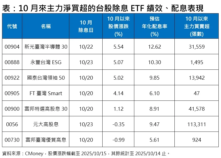 投信法人指出,主力买超张数代表市场资金流向指标,主力资金越集中,显示法人与大型资金对该档ETF的信心越强。本月即将除息的ETF中,除老牌高股息ETF外,主打「高配息、高含积量」题材的新光00904与国泰00922最受瞩目,两档分别将于10月22日与20日除息,除息前夕主力加码、散户跟进,交投热度显著升温。