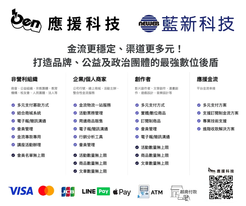 全方位线上整合平台,提供品牌电商、公益与宗教组织、政治团体及创作者可直接使用的募资页面、售票管理、商品贩售到后端物流串接的一站式介面。