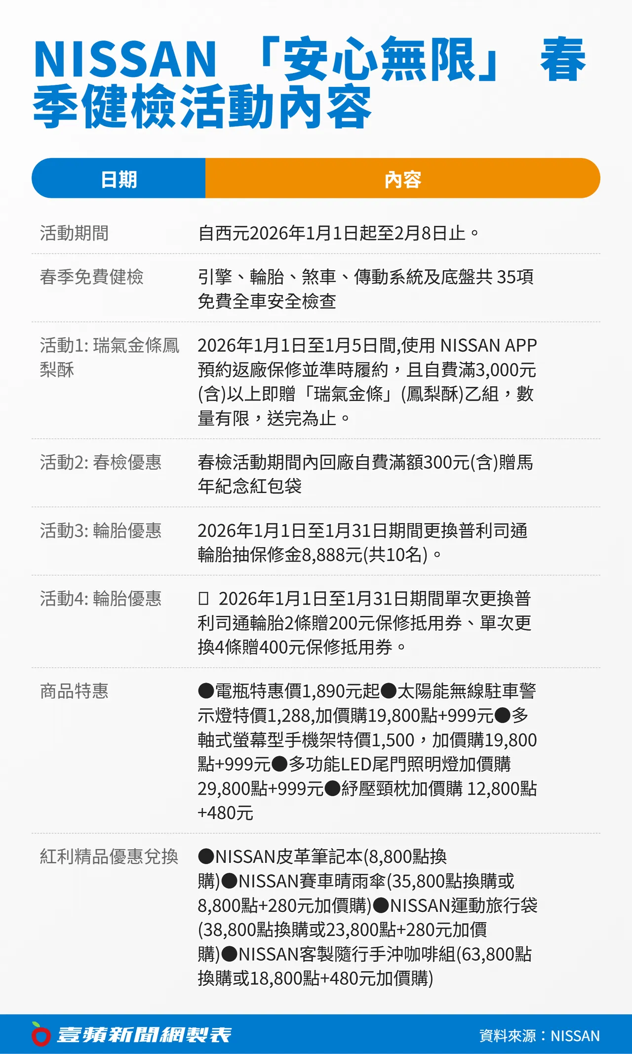 此次春季健检涵盖引擎、底盘、轮胎电瓶、煞车系统与传动系统等重要项目,由专业技师与仪器完成检测,让车主掌握爱车状态。活动期间,指定零件如轮胎、电瓶及选配件享折扣优惠;同时,回厂消费满额还可抽高额保修金,并限时开放红利点数兑换原厂精品。NISSAN表示,此活动旨在提供车主更完整的用车维护选项,提升日常行车安全与便利性。