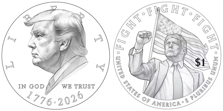 草图显示,硬币正面是川普的侧面肖像,上方刻有「Liberty(自由)」,下方写著「In God We Trust(我们信仰上帝)」以及年份1776 与 2026。背面则描绘了川普在宾州巴特勒(Butler)遇刺未遂后高举拳头 的经典画面,背景是一面随风飘扬的美国国旗,上方印有「FIGHT FIGHT FIGHT」字样。