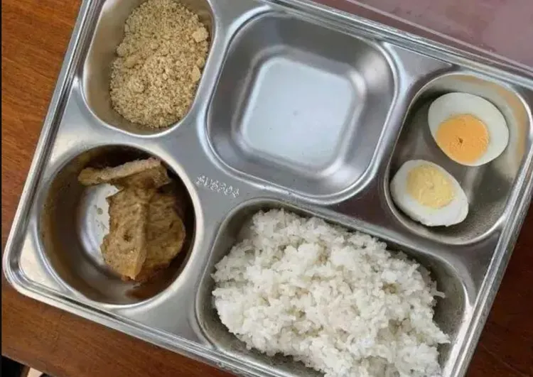越南《劳动报》报导指,这张照片拍的是越南广治省巴屯第一小学10月6日的学生午餐,除了上述食品,还有一碗蔬菜汤,但看来是一片菜叶漂浮在清水中。