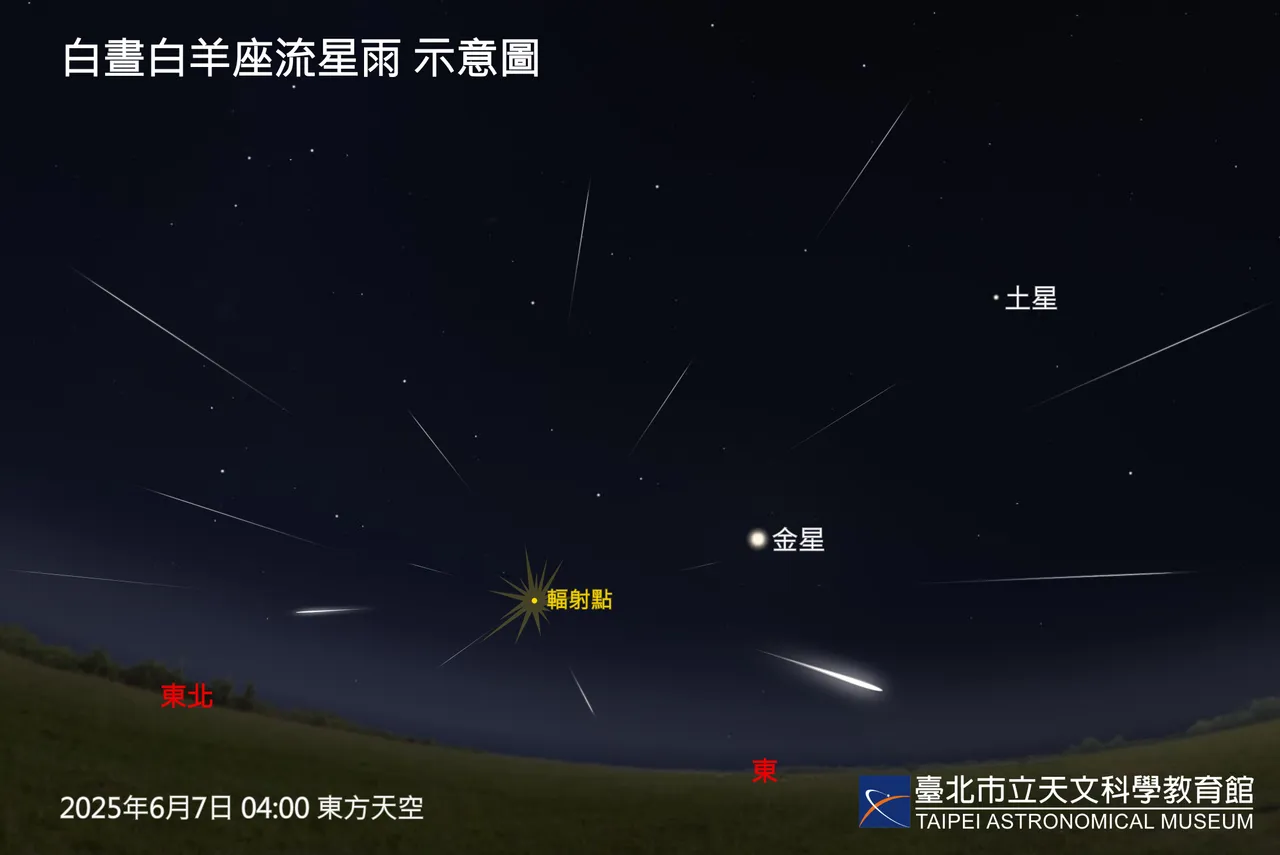 白昼白羊座流星雨即将登场,因辐射点与太阳距离近,多数流星在白天出现,属于肉眼难以观测的「白昼流星雨」,不过7日凌晨3时至天亮前,恰逢无月光干扰,只要天气晴朗,并选择远离光害、东方视野开阔地区,仍有机会目睹这场罕见流星雨。