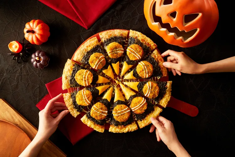 这次「黑咖哩黄金猪排披萨」即日起限时限量登场,大披萨原价780元,期间限定单点优惠价399元。同步还有万圣节色系的副食黑、黄、红配色的「酥炸三味甜不辣」与「巧克力QQ球」可选择。