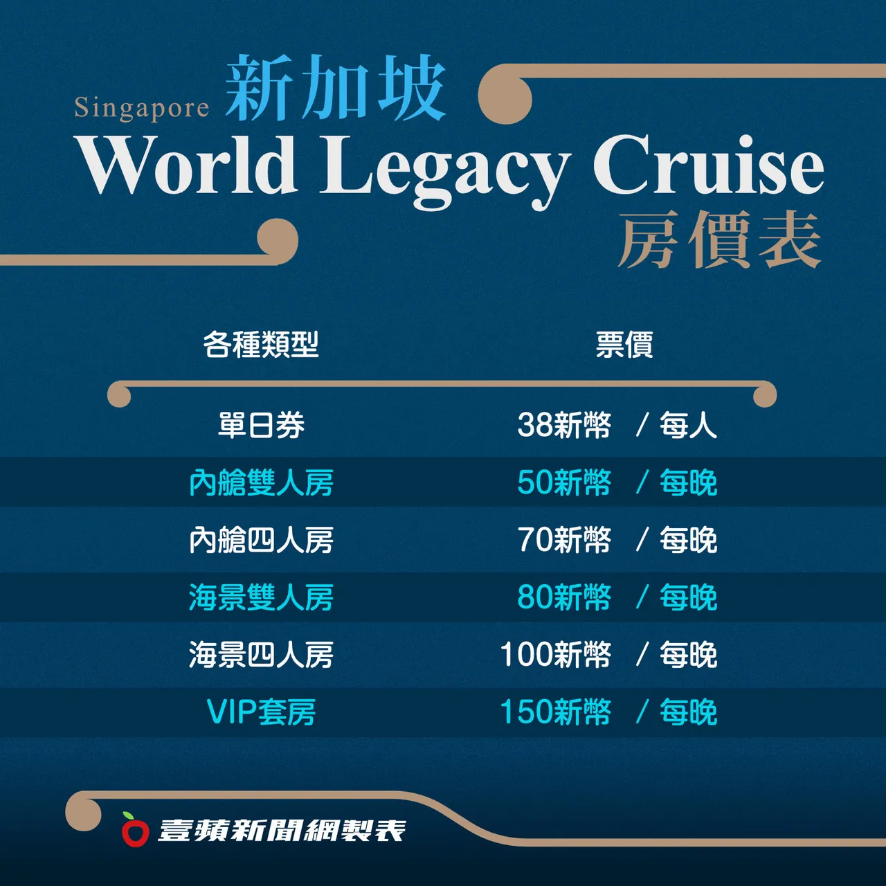 World Legacy Cruise提供的不同票券,除了在舱房、套房过夜的船票外,也有不须入住又能参与游轮所有活动与设施的单日券,除了自由参与游轮上的各种活动之外,还附餐点,只要超值的38元新加坡币。过夜只要每晚50元新加坡币起, World Legacy Cruise的VIP套房每晚只要150元新加坡币,在无敌海景房中睡到自然醒,再去享用一顿价格内含的早餐吃到饱大餐。