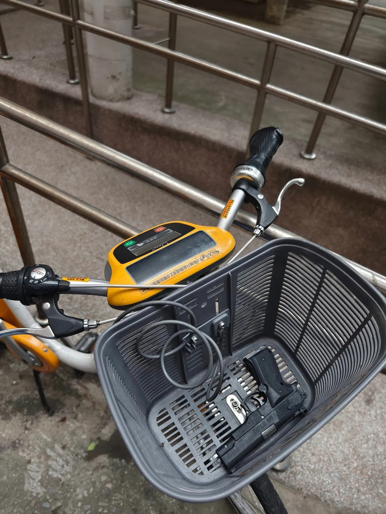当事人在脸书「路上观察学院」发文,贴出他在某处道路要租借Ubike共享单车时,发现旁边的Ubike车头菜篮内,竟有一把黑色手枪,他惊讶拍照存证之于,上网发文问网友说「怎处理好...已派出所备案」。而发文者个人档案资料显示他位于新北市。