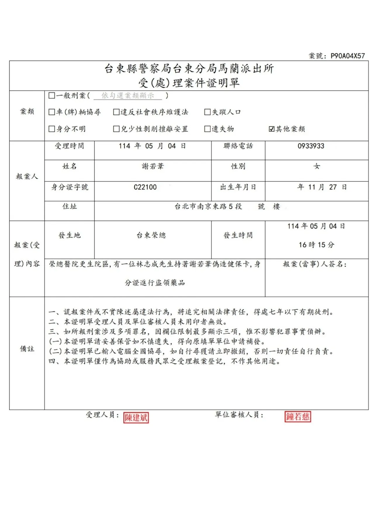 而该警员声称她个资已外泄,要求她到台东制作笔录,谢忻因为人在北部不方便过去,对方表示要回到派出所打视讯电话进行讯问,过没多久警员打来,告知因为派出所经费不足,所以没较正规的摄影设备,因此直接用LINE录影录音。