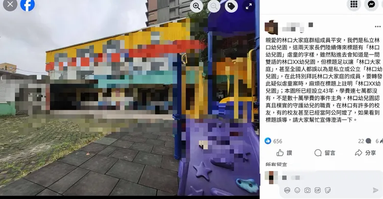 有趣的是,有当地老字号幼儿园今天下午到拥有23万成员的「林口大家庭」脸书社团发文,「亲爱的林口大家庭群组成员平安,我们是私立林口幼儿园」并表示这两天家长们陆续传来标题有「林口幼儿园」虐童的字样,虽然点进去会知道是一间双语的林口XX幼儿园,但标题足以让「林口大家庭」,甚至全国人都误以为是私立或公立「林口幼儿园」。