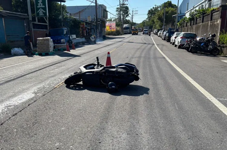 杨梅警分局表示,余姓男子(22岁)今天上午8时19分开堆高机在杨梅区幼狮路二段搬运散落于路面之货物,王姓女子(51岁)骑乘机车行经该处不慎擦撞堆高机牙叉导致连人带车摔倒在地,造成双脚多处擦挫伤,