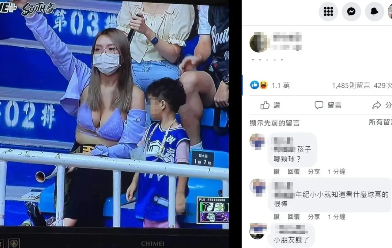 有网友在脸书「爆废公社公开版」发文,贴出一张观看电视赛事转播时,镜头带到一名长发眼镜妹,高举右手替球队、球员加油,而她短版外套内却是仅著近似女性内衣的火辣装扮,胸前大开露出丰满上围,引人侧目。尤其女子身旁一名小男童,视线聚焦在她胸前双峰,画面更形趣味。