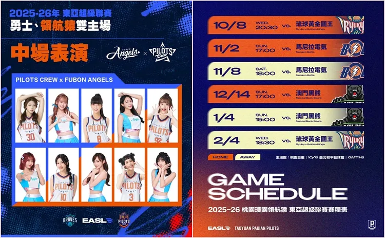 2025东亚超级联赛开幕战将于10月8日开打,在台北和平篮球馆迎来双重对决,首战将由B.LEAGUE冠军宇都宫皇者,对决P.LEAGUE+亚军台北富邦勇士,紧接第二战则是由P.LEAGUE+冠军桃园领航猿,对上日本天皇杯冠军琉球黄金国王。官方也公布领航猿啦啦队 Pilots Crew 将与富邦勇士啦啦队 Fubon Angels 首度合体演出,携手带来前所未有的视觉飨宴。